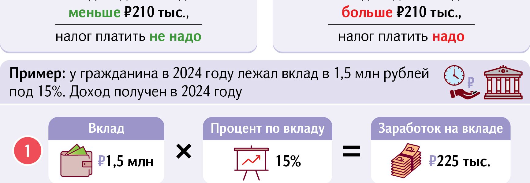 (Ваш доход по вкладу — необлагаемая сумма) × 13% = налог на доход от вклада