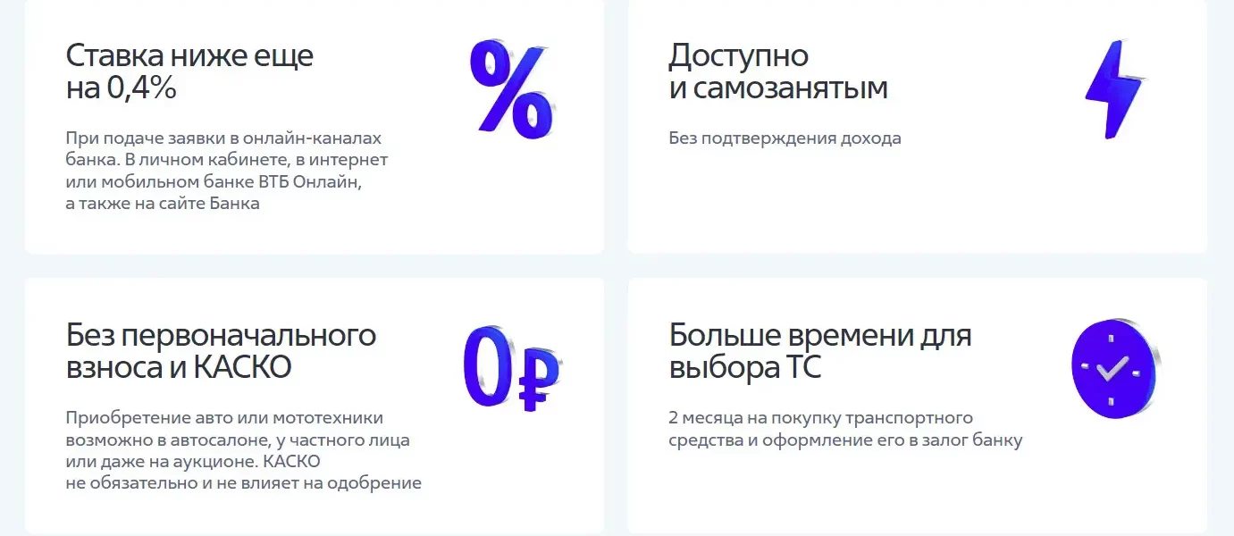 | ВТБ24 | Ставка от 19,9% (по тарифному плану «Автостандарт»), срок — до семи лет, максимальная сумма — 5 000 000 рублей. Первоначальный взнос — от 20%. Для программы «Автолайт» не требуется подтверждение дохода, но максимальная сумма — 2 800 000 рублей. |