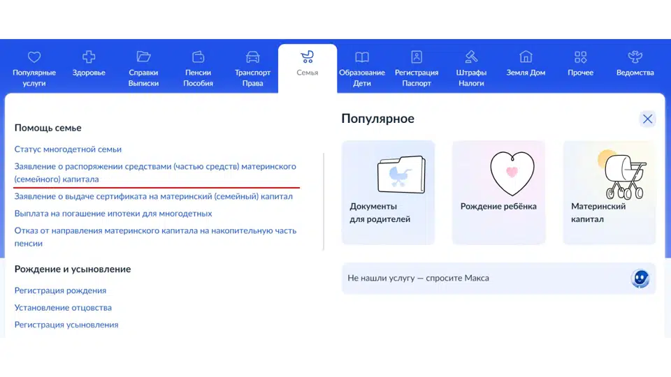 - указание в заявлении о распоряжении направления использования средств материнского капитала, не предусмотренного законом;