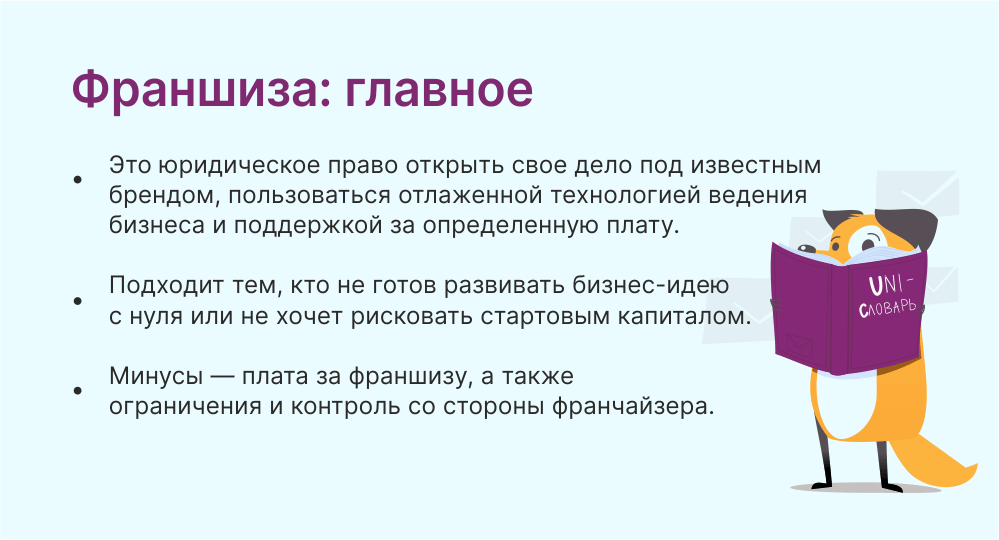 Франшиза — юридическое право вести дело под известным брендом, пользоваться проверенной бизнес-технологией и поддержкой бренда — старшего партнера. Термином обозначают договор о ведении «брендового» бизнеса. Простыми словами, франшиза — это практически готовый бизнес с работающей идеей, раскрученным брендом, четким бизнес-планом и готовыми рекламными материалами. Это близкий к идеальному вариант для тех, кто не готов рисковать стартовым капиталом.