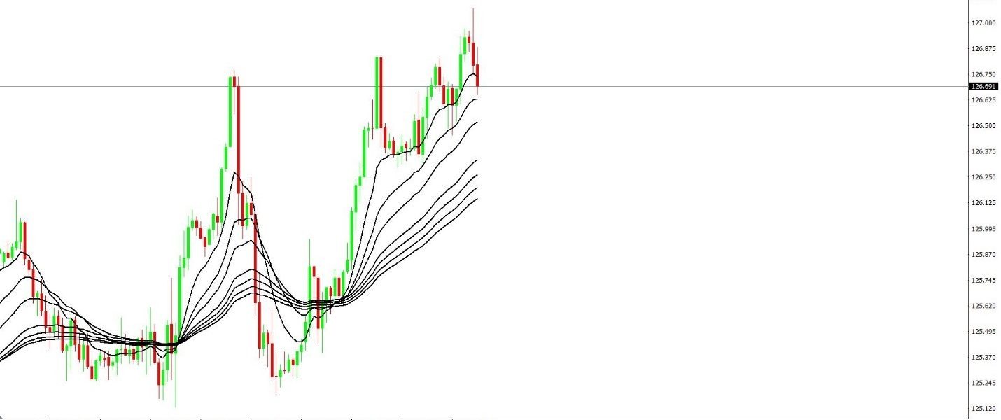Краткосрочная ленточная стратегия использует 8 быстрых EMA с 10 периодами: 10, 20, 30, 40, 50, 60, 70, 80. На графике ниже показаны восемь EMA. Суть торговли с помощью этой стратегии заключается в том, что прочные тренды существуют до тех пор, пока EMA остаются идеально выровненными. Добавление позиции на падениях к более медленным EMA также имеет смысл с точки зрения стратегии.