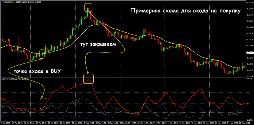 Сама система использует торговые индикаторы, и в частности индикатор средней скользящей (кто не знаком с индикаторами, рекомендую почитать) и осциллятор ADX. При этом именно средняя линия здесь выполняет роль индикатора, по которому определяется тренд.