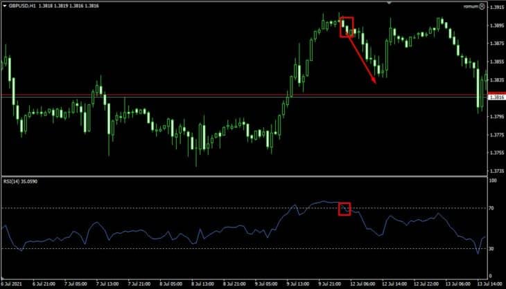 Торговые сигналы появляются на основе пересечения уровней 70 и 30, а если быть более точными на выходе из зон, образуемых этими уровнями. Так при прорыве 70 сверху вниз – торгуем на продажи, а при прорыве 30 снизу вверх – торгуем на покупки.